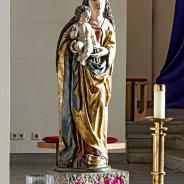 nur ein Altar, an dem an jedem Tage das hl. Opfer dargebracht wird. Das mächtige Kreuz macht zeichenhaft deutlich, was wir als Gemeinde in jeder Meßfeier bekennen: „Deinen Tod, o Herr, verkünden wir…!“ Unübersehbar die Tabernakelsäule mit dem Tabernakel! Vielleicht ist es gerade in unseren Tagen besonders notwendig, die Gegenwart des eucharistischen Herrn so zu betonen. Auf der anderen Seite wissen wir uns mit ihm verbunden durch sein Wort, das uns am Ambo verkündet wird. Nicht vergessen haben wir das Bild der Mutter unseres Herrn. Es ist eine Kopie einer gotischen Madonna. Wenn sie nicht so überdimensional groß ausgefallen ist wie die frühere Marienfigur, so bedeutet das keineswegs eine Geringschätzung Mariens.