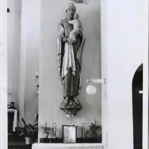 Die neue Marienfigur, eine Kopie einer gotischen Madonna, soll an der Säule, an der einst die Kanzel stand, künftig ihren Platz finden. Das Balkenkreuz, einst nur als Provisorium gedacht, wird durch ein mit einem Corpus versehenes Hängekreuz ersetzt. — Für alle Spenden zur Madonna, zum Kreuz und Tabernakel sagen wir ein herzliches Vergelts Gott!