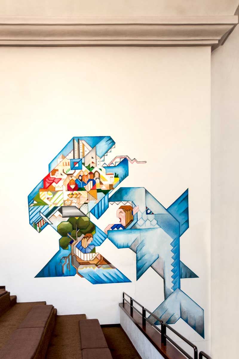 Der Künstler hat die zentralen Motive der Jonageschichte in den berühmten Wal eingezeichnet, in dem Jona drei Tage und drei Nächte verbringen muss, weil er sich dem Auftrag Gottes, der bösen Stadt Ninive das Strafgericht anzusagen, entziehen will.
